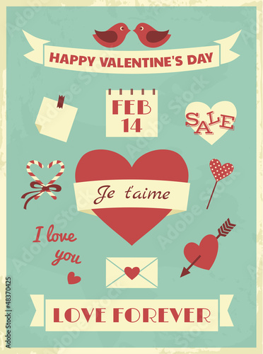 Happy Valentines Day party dekorace, Oslava příslušenství, samolepky, ploché vektorové ilustrace. Tvar srdce složení Valentines Day photo booth rekvizity.