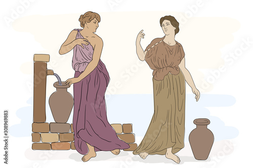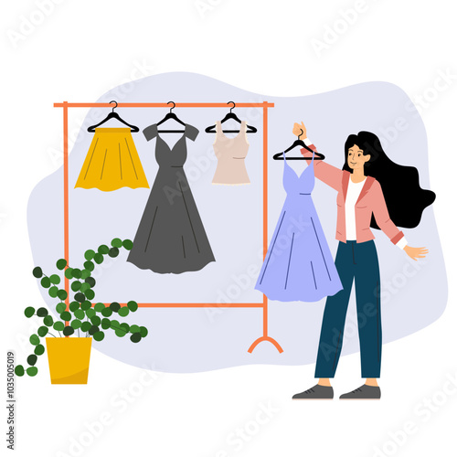 Šťastná žena nakupuje šaty v obchodě s oblečením pro ženy, ploché vektorové ilustrace. Roztomilá dívka drží letní Červené šaty na ramínku. Interiér módního butiku.