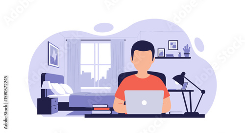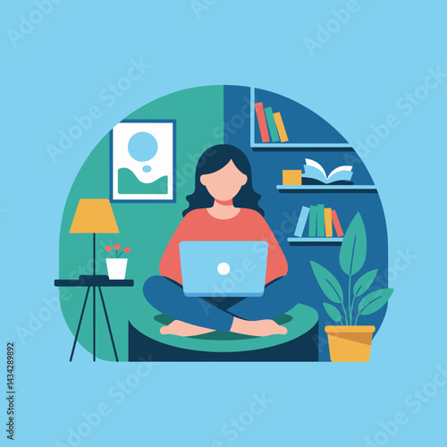 Šťastná žena tráví čas doma. Roztomilá dívka dělá jógu sedí v lotosové pozici, se těší meditaci, ploché vektorové ilustrace. Domácí fitness, každodenní cvičení, ženská jóga, zdravý životní styl