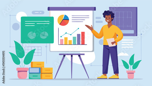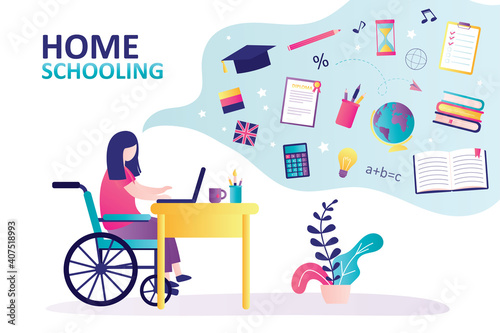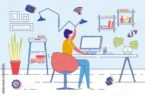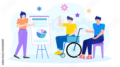Šťastný mladý muž pomocí invalidního vozíku obdivoval umělecké dílo, ploché vektorové ilustrace. Umělecká terapie, léčení a duševní pohoda.