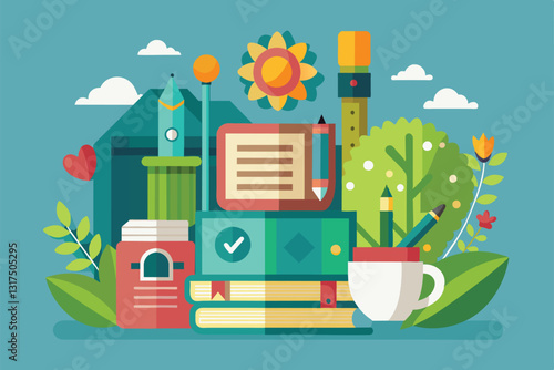 Zdravotní péče vektor plochý styl designu ilustrace. Stetoskop, tableta, pilulky, odznak lékaře, injekční stříkačka s červenou injekcí. Lékařské vybavení a léky pro webový banner, webovou stránku atd.