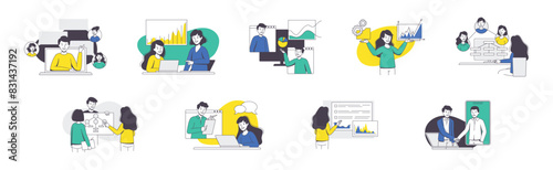Vektorový soubor zdravotnického personálu poskytujícího zdravotní péči pacientům. Hostující lékař psychoterapeut, dietolog a plastický chirurg plochý styl designové prvky, ikony izolované na bílém pozadí.