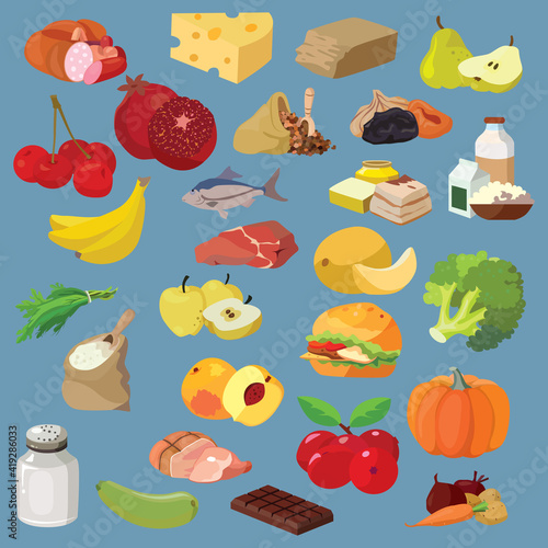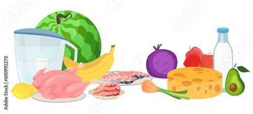 Zdravý potravinářský výrobek k přípravě snídaně, oběda nebo večeře. Zralé čerstvé ovoce a zelenina, syrové kuře a vepřové maso, nakrájené mořské plody, hlava tvrdého sýra a filtrovaná voda, balené mléko