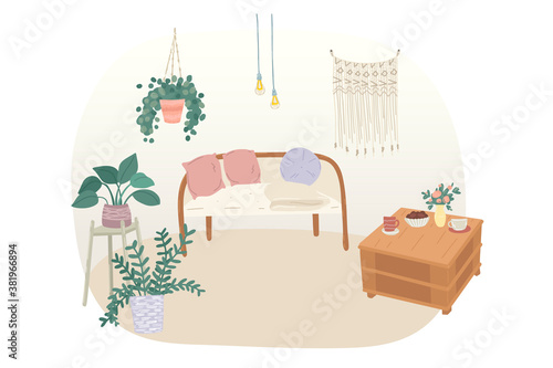 Mladá žena cvičí jógu doma, vektorové ploché ilustrace. Sport a zdravý životní styl, domácí cvičení jógy, kondiční trénink, sportovní aktivita.