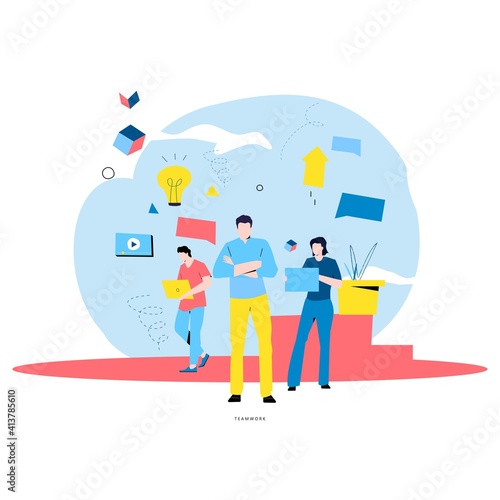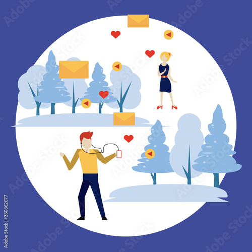 Obrovská sklenice čerstvého organického ovocného smoothie s borůvkami, banány a kostkami ledu, výroba a pití koktejlu mikro postav, vektorová ilustrace. Zdravá snídaně nebo svačina koncept pro webové stránky