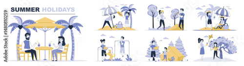 Turistika vstupní stránky design, webové stránky banner šablony set, plochý vektorový ilustrace. Turistický tábor. Žena turista vaření jídla na táboráku. Trekking dobrodružství, letní kempování, pěší turistika.