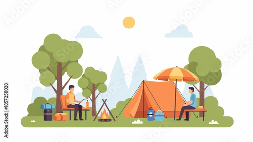 Turistická scéna, plochá vektorová ilustrace. Turistická mužská postava sedící u stanu a táboráku. Africký americký cestovatel kempování, turistika. Trekking, letní turistika, dobrodružství, expedice.