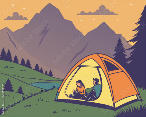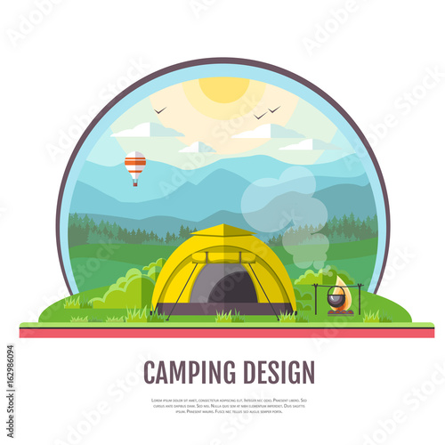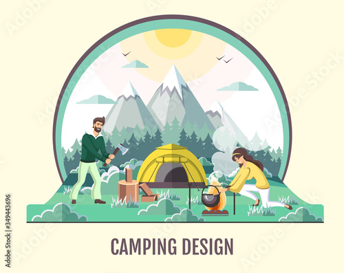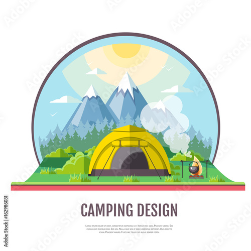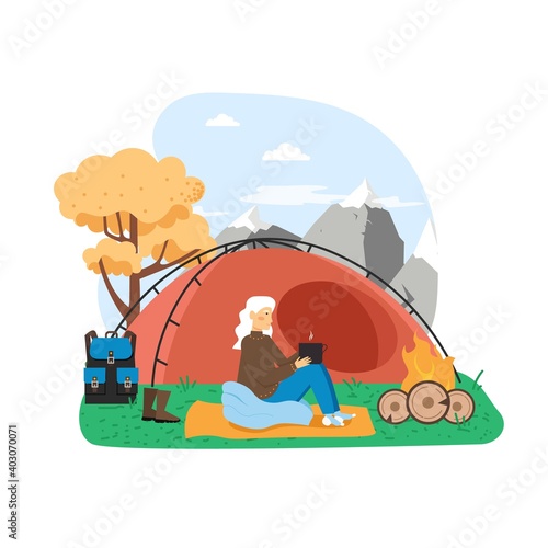 Turistická scéna, plochá vektorová ilustrace. Cestovatel, turistka ženská postava sedí u táboráku s šálkem horkého čaje. Trekking, přírodní turistika, dobrodružství, expedice, kempování.