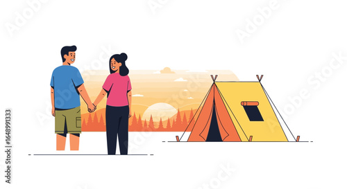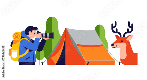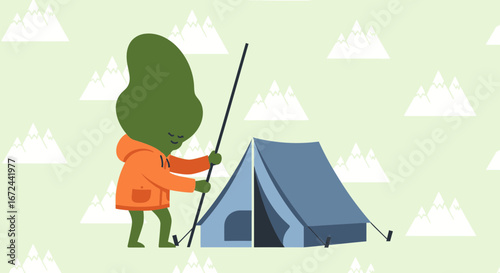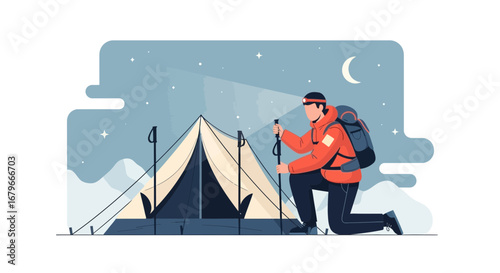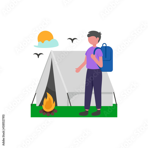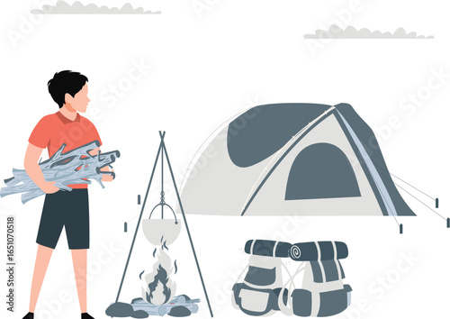 Turistická scéna, plochá vektorová ilustrace. Cestovatel, turistka ženská postava vaření jídlo v ohni v nadhazovači. Trekking, expedice, Cestovní dobrodružství, přírodní turistika, kempování, letní outdoorové aktivity.