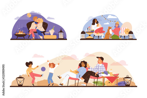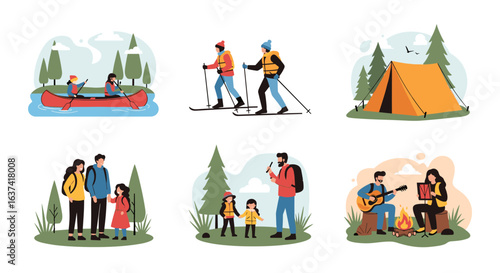 Sada turistických scén, plochá vektorová ilustrace. Cestovatelé, turisté s batohy jít pěší turistiku, vaření jídlo v ohni, lezení na skále. Trekking, horská turistika, Cestovní dobrodružství, expedice, letní kempování