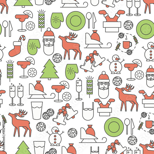 Dovolená Vánoce a Nový rok linka bezešvé vzor. Vektorová ilustrace balicího papíru v designu lineárního stylu. Grafické ikony s hračkami a dárky prvky.