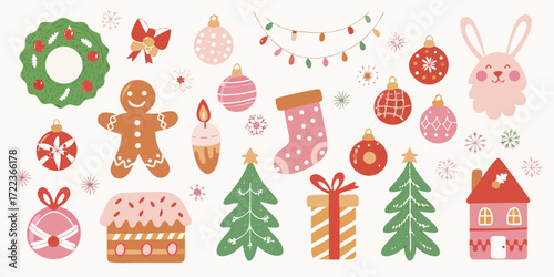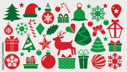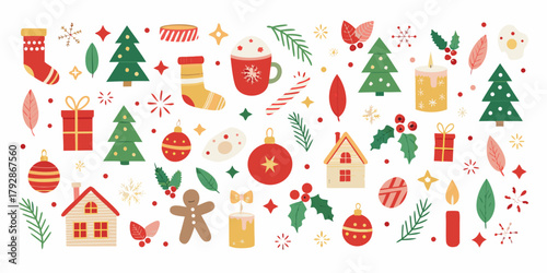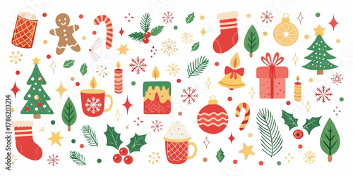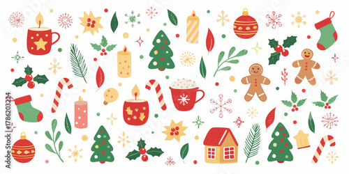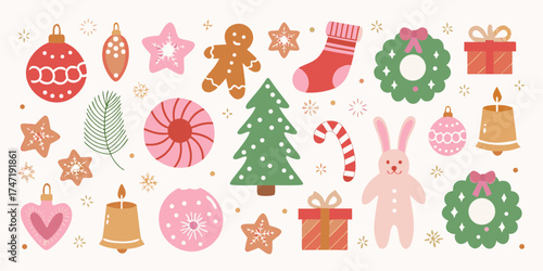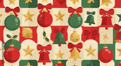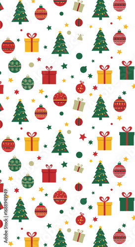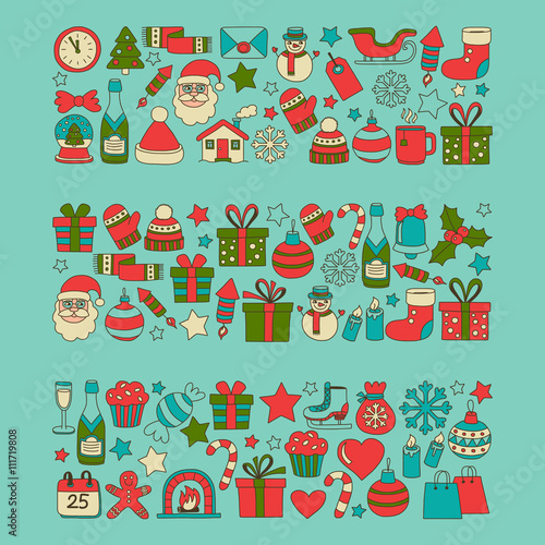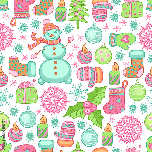 Dovolená Vánoce a Nový rok linka bezešvé vzor. Vektorová ilustrace balicího papíru v designu lineárního stylu. Grafické ikony s hračkami a dárky prvky.