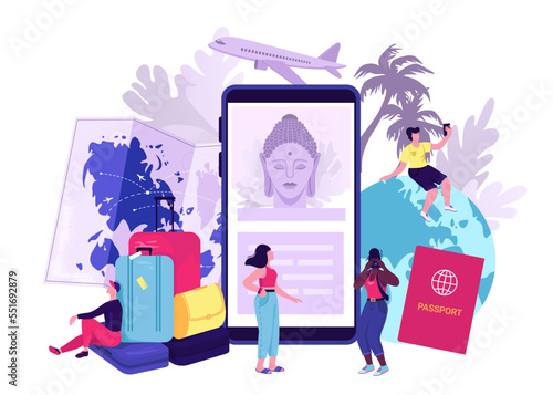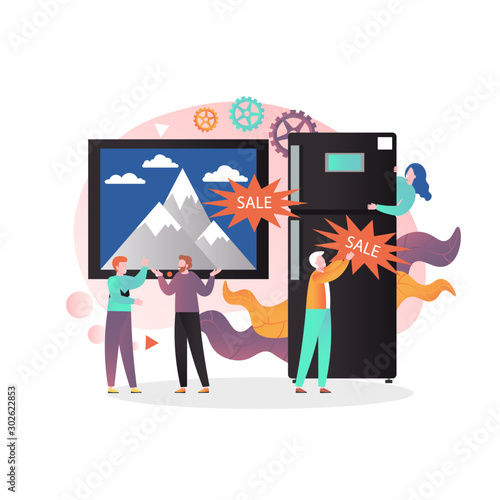 Vybavení domácnosti prodej vektorové koncepce ilustrace. Obrovský televizor a lednice a mikro znaky kupující a prodavač.