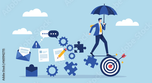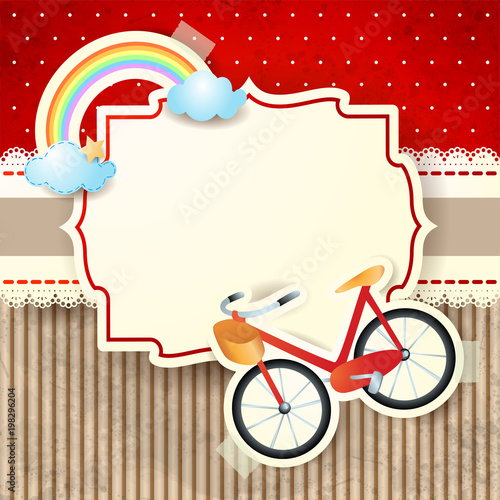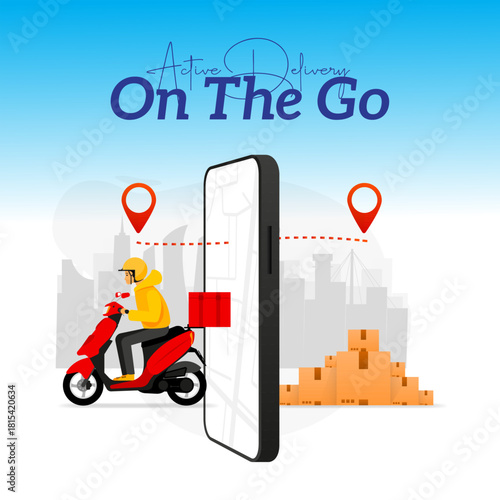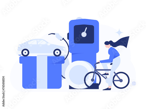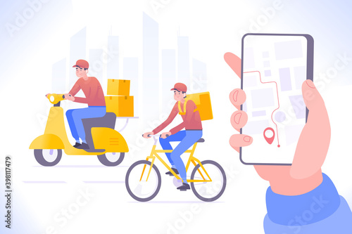 Mladý muž kurýr doručující zásilku na dveře ženy na kole, vektorový plochý design ilustrace. Bike messenger, koncept doručovací služby pro plakát, banner atd.