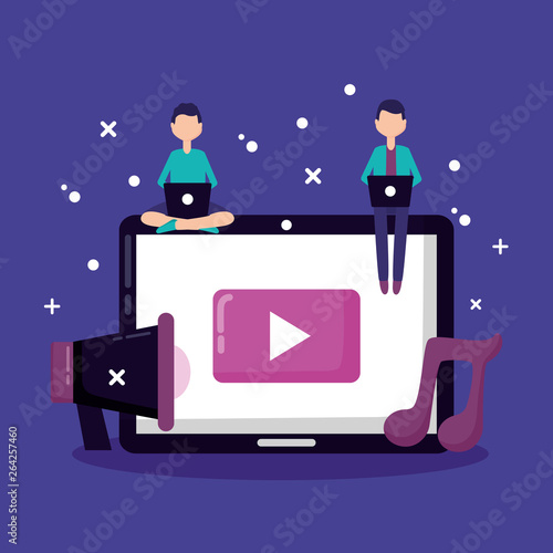 Profesionální interiérový designér tým aranžování nábytku na obrovské obrazovce přenosného počítače. Online služby interiérového designu vektorový koncept pro webový banner, webovou stránku atd.