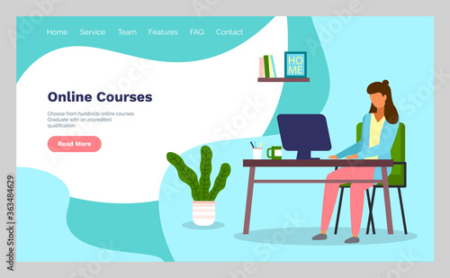 Vektorová šablona webových stránek domácí kanceláře, design webových stránek a vstupních stránek pro vývoj webových stránek a mobilních stránek. Mladá dívka pracuje doma pomocí přenosného počítače, zatímco sedí u stolu. Práce na volné noze.