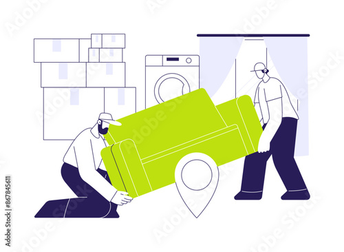 Mužské postavy, domácí přemístění pracovníků společnosti nakládání pohybujícího se kamionu, vektorový plochý design ilustrace. Přemístění, stěhovací dům, koncept služeb dodávky nábytku.