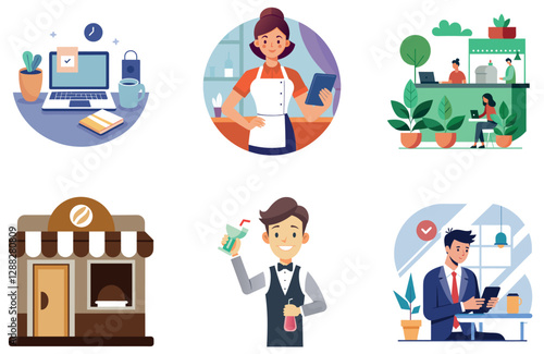 Sada oprav a úklidových služeb domů, vektorová plochá ilustrace. Čištění dámy praní prádla, vysávání koberců, úklid domu. Elektrikář, instalatér výměna žárovky, upevnění ucpaný kuchyňský dřez.