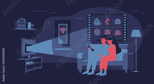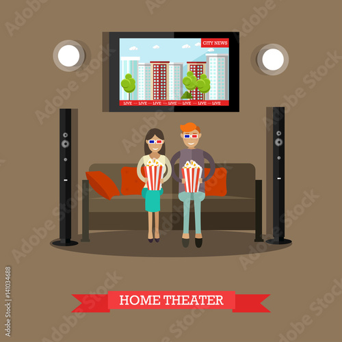 Vektorová ilustrace mladého páru ve 3d brýlích sledujících zprávy z města a jíst popcorn. Designový prvek domácího kina v plochém stylu.