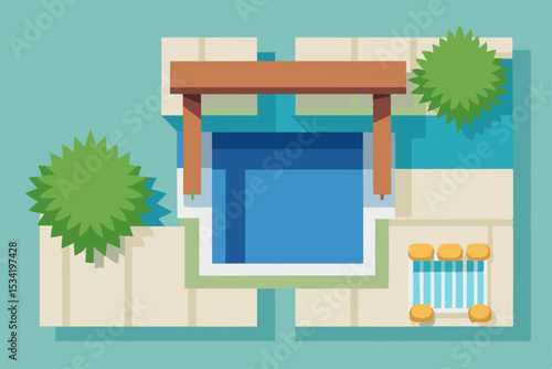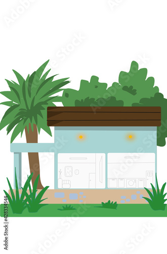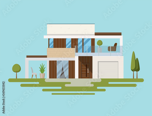 Domácí yard vektor. Dům dvorek ilustrace. Zahrada, plot, trávník, obytný byt a vybavení bbq pozadí