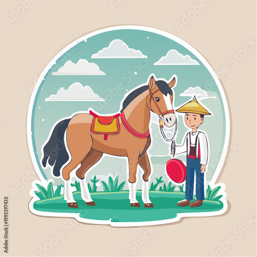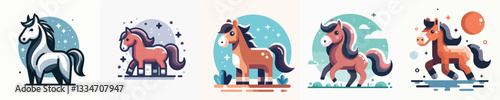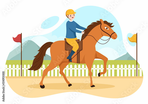 Jízda na koni vektor plochý styl designu ilustrace. Dostihový kůň, skákací bariéra, hřeben, boty, pohár, jablko a podkova. Dostihové vybavení, jezdecká sportovní sada pro webový banner, webová stránka.
