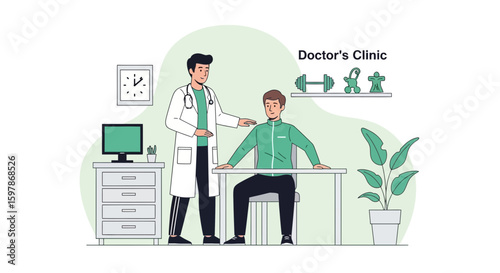 Nemocnice scéna set, plochý vektor ilustrace. Pacienti v recepci lékařské kliniky, Čekárna, ordinace lékaře. Péče o osoby se zdravotním postižením. Lékaři jmenování, konzultace, léčba.