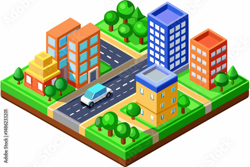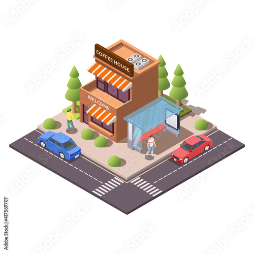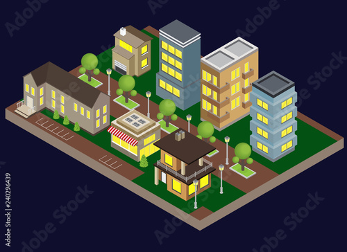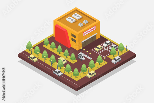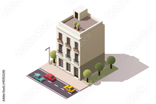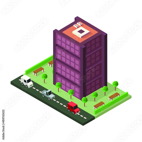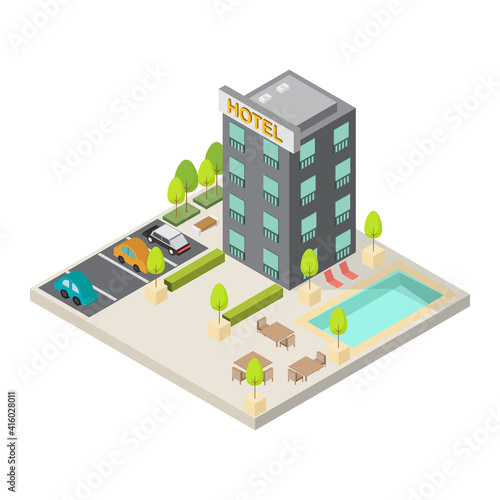Budova hotelu na obrazovce mobilního telefonu ve vektorovém izometrickém stylu. Rezervace hotelu online pomocí smartphonu. Ilustrace v plochém 3D designu. Budova hotelu izolovaný prvek.