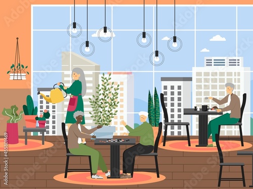 Hoteloví hosté mají večeři v kavárně nebo restauraci, plochý vektorový obrázek. Hotel food service. Pohostinství.