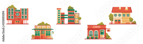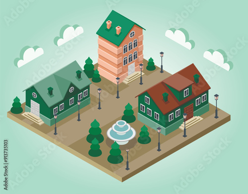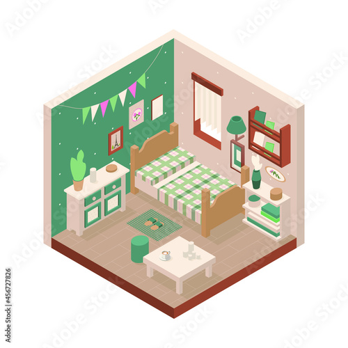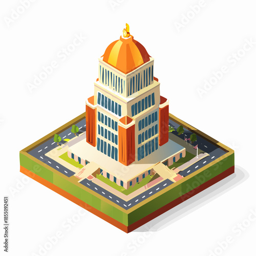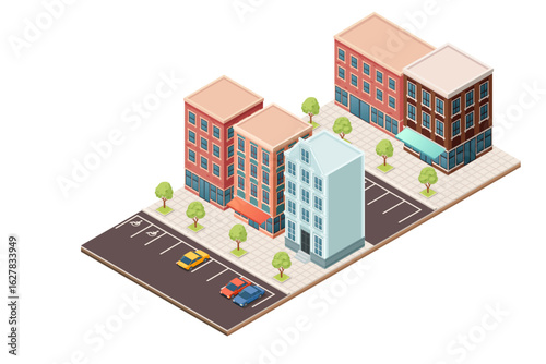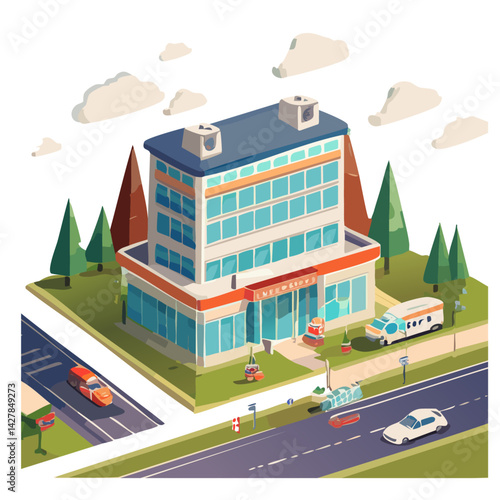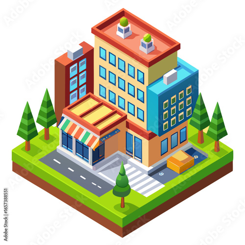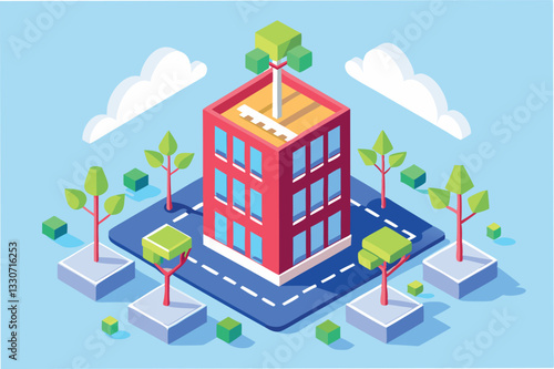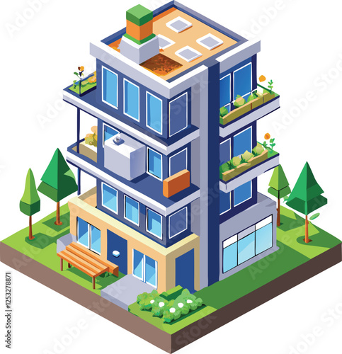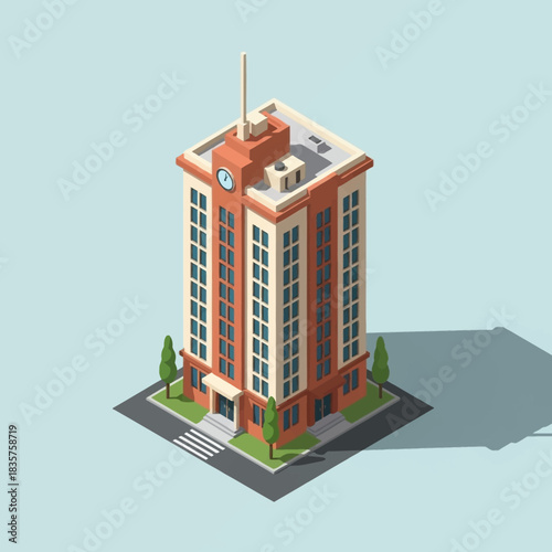 Ikona hotelu ve vektorovém izometrickém stylu. Ilustrace v plochém 3D designu. Budova hotelu izolovaný prvek. Městská městská architektura pro web a herní design. Kavárna na vrcholu budovy.