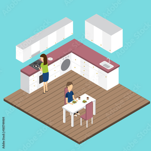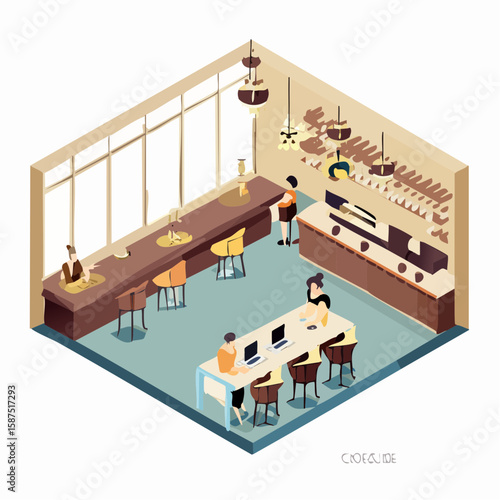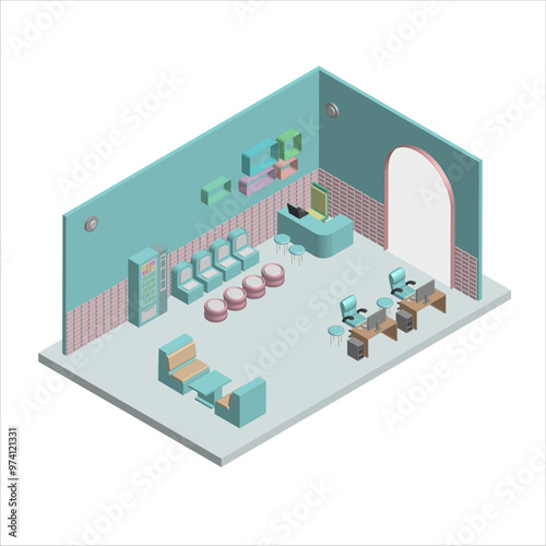 Interiér recepce hotelu ve vektorovém izometrickém stylu. Ilustrace v plochém 3D designu. Hotelový pokoj ve vstupní hale.