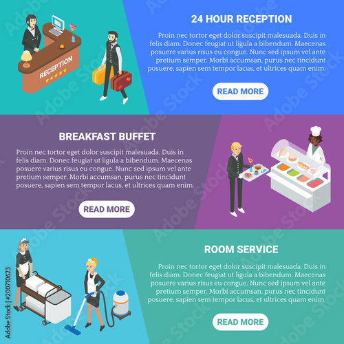Hotel service vektorové ploché izometrické horizontální banner set. 24 hodinová recepce, snídaně formou bufetu, pokojová služba koncept designové prvky.