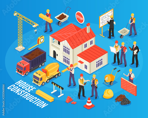 Infografika hotelových služeb. Vektorový plochý izometrický vývojový diagram s budovou hotelu, hotelovým personálem a turistickým mužem.