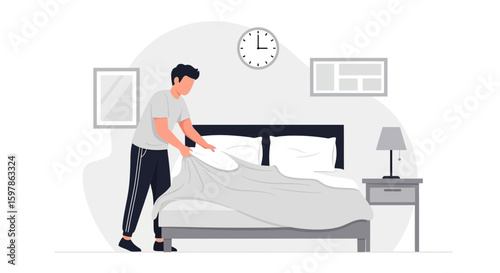 Pokojská dělat postel, Hospodyně čištění hotelový pokoj, vektorové ilustrace. Hotelová pokojová služba, koncept úklidu pro webový banner, webovou stránku atd.