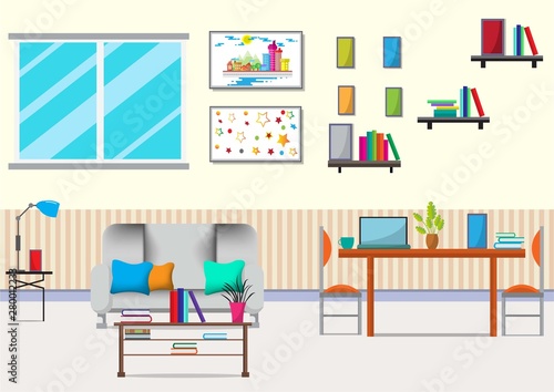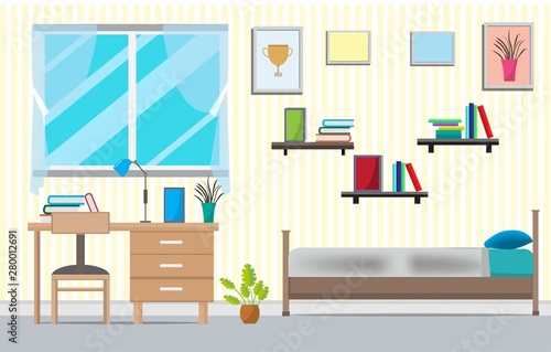 Vektorové ilustrace hotelového apartmá. Luxusní ložnice, luxusní interiér hotelového pokoje. Hotelový číšník, manažer a hosté Mladý pár. Plochý design.