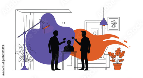 Obrovský architektonický plán a mikro mužské postavy inženýr architekt s tužkou, stavební dělníci, vektorové ilustrace. Koncept budovy domu pro webový banner, webovou stránku atd.