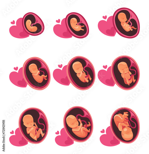 Evoluce lidského embrya, ploché vektorové ilustrace. Fáze těhotenství měsíc po měsíci, embryonální a fetální vývoj. Anatomie.