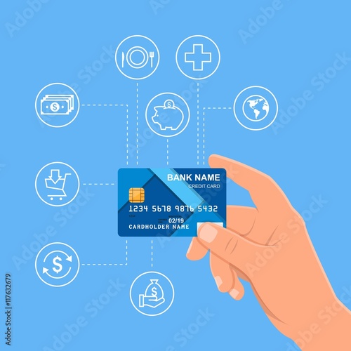 Lidská ruka drží bankovní kreditní kartu. Finanční a peněžní platby koncept vektorové ilustrace v plochém stylu.