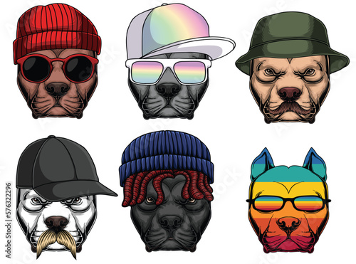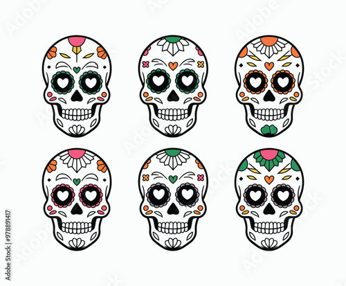 Lidská lebka v obličeji šátek set, vektorové ručně kreslené ilustrace izolovaných na bílém pozadí. Lebka s iroquois, na sobě klobouk a čepici, tričko grafika.