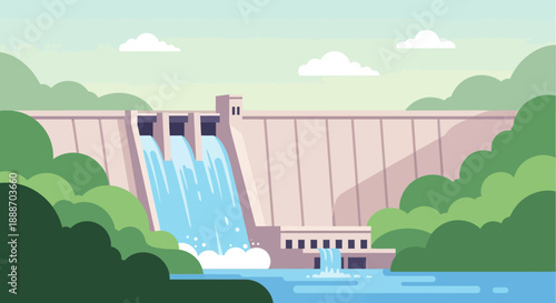 Vodní elektrárna a továrna. Hydroenergetický průmyslový koncept. Vektorové ilustrace v plochém stylu. Vodní elektrárna pozadí. Energie.