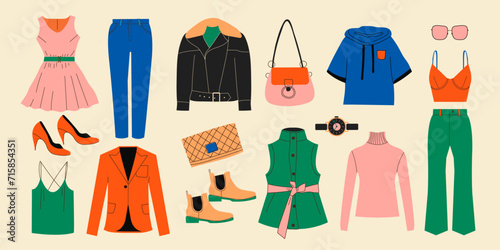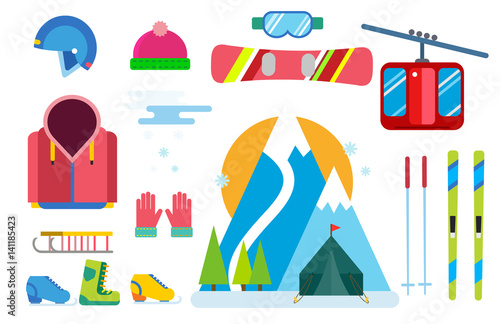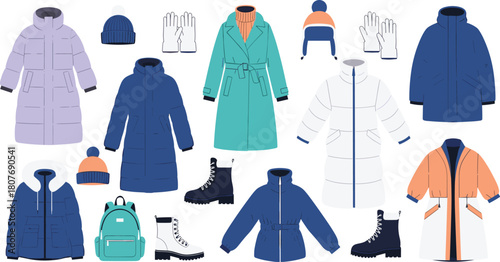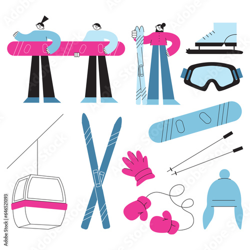 Lovné zařízení na led. Zařízení pro zimní rybolov, ploché vektorové izolované ilustrace. Teplé oblečení, boty, rukavice. Rybářské náčiní a příslušenství. Zimní outdoorové sportovní aktivity, hobby.