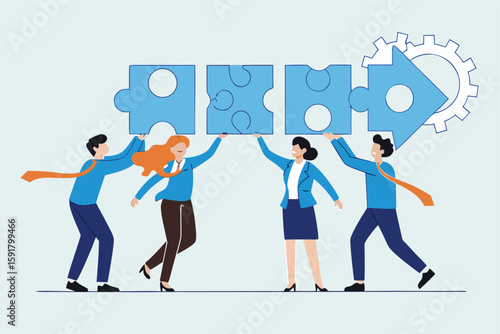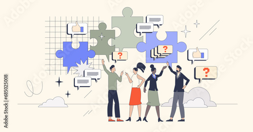 Tvorba nápadů, vektorový plochý design ilustrace. Tiny business people team uvedení velké žárovky skládačky dohromady. Brainstorming, týmová práce, koncept obchodní inovace pro webový banner atd.