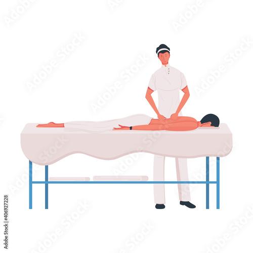 Indická žena masér dělá masáž zad do ženské klient vektorové ikony izolované pozadí.