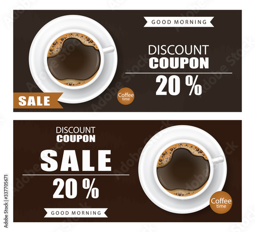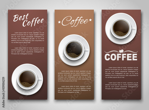 Reklamy na instantní kávu. Vektorové realistické ilustrace instantní kávy balení sáčku flexibilní stojící Ziplock sáček maketa a šálek kávy. Klasický kávový banner, šablona návrhu plakátu.