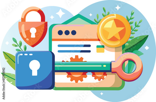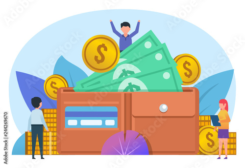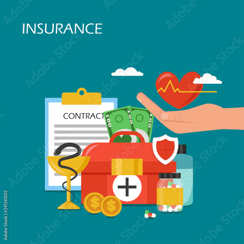 Pojištění koncept vektorové ploché ilustrace. Auto na lidské ruce dlaň, Aktovka, smlouva, dolarové mince a bankovky, lékárnička a zeměkoule. Zdraví, obchodní riziko a pojištění vozidla plakát, banner.