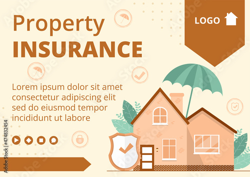 Pojištění koncept vektor plochý styl design ilustrace. Dům pod deštníkem, zeměkoule, peníze, smlouva a záchranný kruh. Plakát pojištění domu, banner.