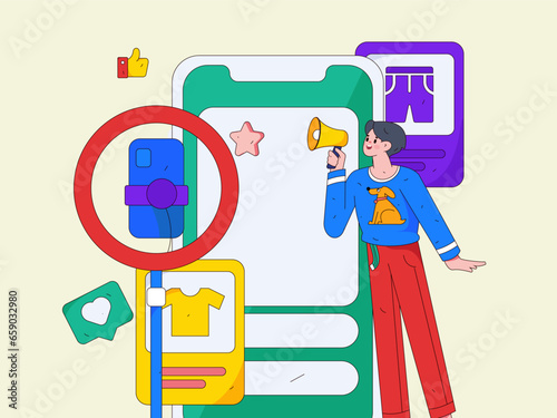 Internet trolling koncept vektorové ilustrace. Obrovský smartphone se špatnými komentáři, nelíbí, drobné postavy rozrušená dívka, pár hádky v chatu. Urážlivé provokativní online vysílání, kyberšikana.