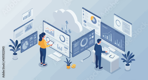Výnosy z investic, ploché vektorové izometrické ilustrace. Podnikatel investor při pohledu na finanční investiční typy příjmů zvyšování grafu, analýza zisku, dividendy růst graf.