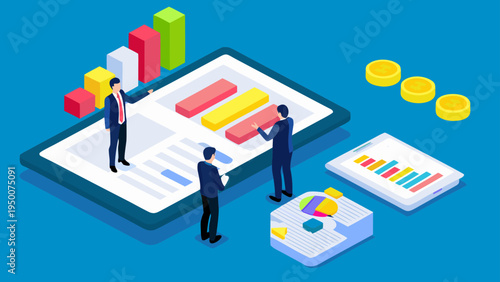Výnosy z investic, ploché vektorové izometrické ilustrace. Podnikatel investor při pohledu na finanční investiční typy příjmů zvyšování grafu, analýza zisku, dividendy růst graf.