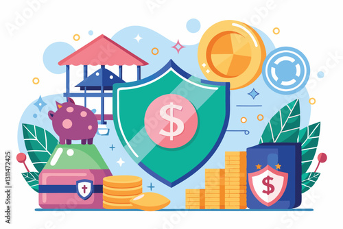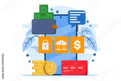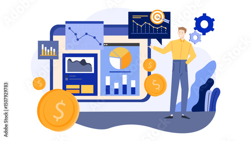 Investice do bitcoin concept vektorové ilustrace. Peněženka s dolarovými mincemi, počítačový monitor s nápisem bitcoin a dolarové mince odvozené z investic do kryptoměny bitcoin. Plochý design.