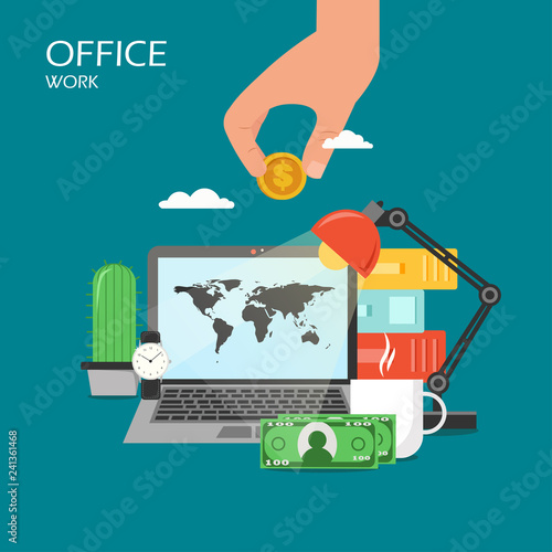 Investice do koncepce vzdělávání vektorové ploché ilustrace. Laptop, zeměkoule, akademická promoce čepice, lidský mozek, ruka drží dolarovou minci. Obchodní investice do rozvoje lidského kapitálu plakát, banner.